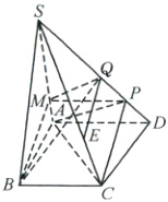 (1)知BM//CP,又因为BM⊄平面SCD,CP⊂平面SCD,所以BM//平面SCD,又因为BM⊂平面BMQ,平面BMQ∩平面SCD = QE,所以BM//QE.又因为BM//CP,所以QE//CP,所以$\frac{SE}{EC}=\frac{SQ}{QP}=2$.
