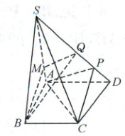 (1)得CP//BM,又因为CP⊄平面BMQ,BM⊂平面BMQ,所以CP//平面BMQ.在△SAP中,$\frac{SQ}{SP}=\frac{2}{3}=\frac{SM}{SA}$,所以MQ//AP,又因为AP⊄平面BMQ,MQ⊂平面BMQ,所以AP//平面BMQ,又因为AP∩CP = P且AP,CP⊂平面ACP,所以平面ACP//平面BMQ.