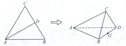 5. ACD 因为△ABC为等边三角形,AD是边BC上的高,所以AD⊥DC,AD⊥DB,翻折后AD⊥DC,AD⊥DB,又DC∩DB = D,DC,DB⊂平面BCD,DC,DB⊂平面BCD,所以AD⊥平面BCD,故A正确;如图,连接CG,因为AD⊥DC,AD⊥DB,所以二面角B - AD - C的平面角为∠CDB = 60°,所以△CDB为等边三角形,所以BD⊥CG,由A可知,AD⊥平面BCD,CG⊂平面BCD,所以AD⊥CG,又AD∩BD = D,AD,BD⊂平面ABD,所以CG⊥平面ABD,过点G作MG⊥AB,连接MC,因为CG⊥平面ABD,AB⊂平面ABD,所以CG⊥AB,又MG∩CG = G,CG,MG⊂平面CMG,所以AB⊥平面CMG,因为MC⊂平面CMG,所以CM⊥AB,则∠CMG为二面角C - AB - D的平面角.又CG = 2sin60° = $\sqrt{3}$,GM = BG·sin60° = $\frac{\sqrt{3}}{2}$,在Rt△CGM中,$\tan∠CMG=\frac{CG}{MG}=\frac{\sqrt{3}}{\frac{\sqrt{3}}{2}}=2$,即$\tanα = 2$,故B错误;取AD,CD的中点分别为N,H,连接NG,HG,NH,所以NG//AB,HG//BC,又NG⊄平面ABC,AB⊂平面ABC,所以NG//平面ABC,同理可证得HG//平面ABC,又NG∩HG = G,NG⊂平面GNH,HG⊂平面GNH,所以平面GNH//平面ABC,又平面GNH∩平面ACD = NH,所以点P的轨迹为线段NH,NH = $\frac{1}{2}AC = 2$,所以点P의轨迹长度为2,故C正确;设点D到平面ABC的距离为h,在△ABC中,AB = AC = 4,BC = 2,所以边BC上的高为$\sqrt{4^{2}-1^{2}}=\sqrt{15}$,所以△ABC的面积为$\frac{1}{2}×2×\sqrt{15}=\sqrt{15}$,根据$V_{C - ABD}=V_{D - ABC}$,即$\frac{1}{3}×\frac{1}{2}×2×2\sqrt{3}×\sqrt{3}=\frac{1}{3}×\sqrt{15}×h$,解得$h=\frac{2\sqrt{15}}{5}$,即点D到平面ABC的距离为$\frac{2\sqrt{15}}{5}$,故D正确.