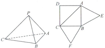 8. [2024湖南长沙期末]如图,已知在三棱锥P-ABC的平面展开图中,四边形ABCD为边长等于√{2}的正方形,△ABE和△BCF均为正三角形,在三棱锥P-ABC中.