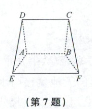 7. [2024 浙江杭州期末]我国古代数学著作《九章算术》中记载了一种称为“羡除”的几何体,该几何体的一种结构是三个面均为梯形,其他两面为三角形的五面体. 如图所示,四边形 $ABCD$, $ABFE$, $CDEF$ 均为等腰梯形,$AB// CD// EF$,$AB = 6$,$CD = 8$, $EF = 10$,$EF$ 到平面 $ABCD$ 的距离为 5,$CD$ 与 $AB$ 之间的距离为 10,则这个“羡除”的体积 $V =$