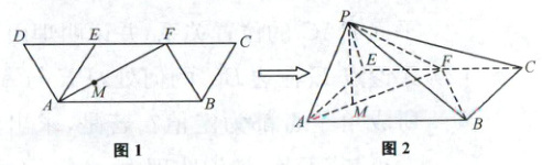 4. [2025江苏苏州期末]已知等腰梯形AB-CD中,AB=2,DC=3,∠ADC=60°,E,F是线段DC的两个三等分点(E在F的左侧),M是线段AF上靠近A的三等分点(如图1).将△DAE沿AE翻折到△PAE的位置,连接PB,PC得到四棱锥P-ABCE(如图2).