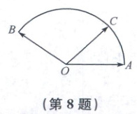 8.$[0,2+\sqrt{3}]$ 由题意,可得$|\overrightarrow{OC}|=1$,则$(a\overrightarrow{OA}+b\overrightarrow{OB})^2=1$,整理得$a^2|\overrightarrow{OA}|^2+2ab\overrightarrow{OA}·\overrightarrow{OB}+b^2|\overrightarrow{OB}|^2=1$,由$|\overrightarrow{OA}|=|\overrightarrow{OB}|=1$,$\angle AOB=\frac{5\pi}{6}$,得$\sqrt{3}ab+1=a^2+b^2$,可得$\sqrt{3}ab+1\geq2ab$,解得$\sqrt{3}-2\leq ab\leq2+\sqrt{3}$,由题图易知$a\geq0$,$b\geq0$,所以$ab\in[0,2+\sqrt{3}]$.
