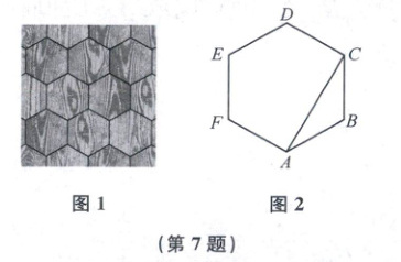 7. [2023 河南郑州月考]如图 1,小明同学发现家里的地板是由正六边形木质地板组合而成的,便临摹出了家里地板的部分图形,其平面图如图 2 所示,若$\overrightarrow{AC}=x\overrightarrow{AB}+y\overrightarrow{AF}$,则$x + y=$