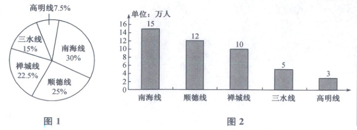 6. [多选题,2025 广东佛山期末]佛山 50 公里徒步自 2016 年首次推出 5 条路线实现“五龙汇聚”,参与人数逐年增加,到 2025 年,现场参与人数为 45 万,这不仅是一场全民健身的狂欢,更是佛山城市品牌的一次璀璨展示.下面分别为 2016 年佛山 50 公里徒步参与人数的扇形统计图(图 1)、2025 年佛山 50 公里徒步参与人数的条形统计图(图 2,单位:万人),已知 2025 年高明线的参与人数是 2016 年的 2 倍,则(