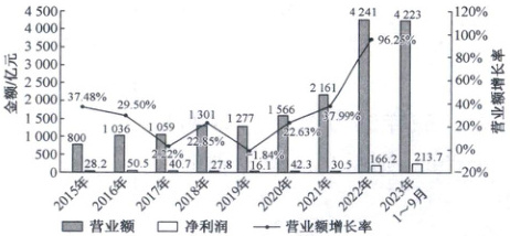5. [多选题,2024 广东华侨中学期末]如图为某新能源汽车企业 2015—2022 年及 2023 年 1~9 月份的营业额(单位:亿元)、净利润(单位:亿元)及 2015—2022 年营业额的增长率的统计图.已知 2023 年第二、三、四季度的净利润相比上季度均增长 10%,则下列结论正确的是(