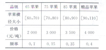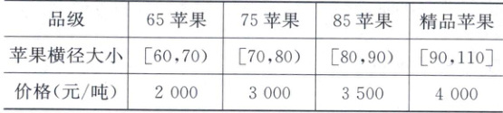 (2)若该批苹果销售有两个方案,方案一:全部苹果按每吨 3 000 元销售;方案二:分级销售,分级销售的价格表如下. 假设苹果均可以全部售完,哪一种方案的销售总额更高?