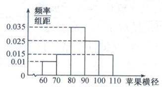 (1)根据题意得,该批苹果横径不小于90的频率为$(0.025 + 0.015)×10 = 0.4$.设苹果横径的上四分位数$m$,由题知$m \in [90,100)$,所以$10×(0.01 + 0.015 + 0.035) + (m - 90)×0.025 = 0.75$,解得$m = 96$,所以苹果横径的上四分位数为96.