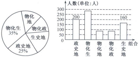5. [多选题,2024 海南期末]某学校对高一学生选科情况进行了统计,发现学生选科仅有物化生、政史地、物化地、物化政、生史地五种组合,其中选考物化地和物化政组合的人数相等,并绘制得到如下的扇形图和条形图,则 (