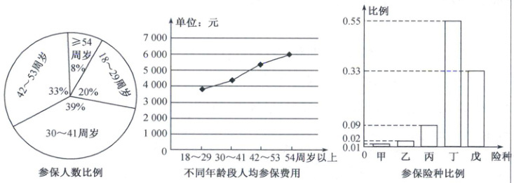 5. AD 对于A,由扇形图可知,30~41周岁的参保人数最多,故A正确;对于B,由折线图可知,随着年龄的增长人均参保费用越来越多,故B错误;对于C,由扇形图可知,30周岁以上的参保人数约占总参保人数的80\%,故C错误;对于D,由柱状图可知,丁险种参保比例最高,故D正确。