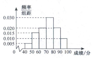 (2)由频率分布直方图可知,成绩在[40,50)内的频率为0.005×10=0.05,成绩在[50,60)内的频率为0.015×10=0.15,成绩在[60,70)内的频率为0.020×10=0.2,成绩在[70,80)内的频率为0.030×10=0.3,成绩在[80,90)内的频率为0.020×10=0.2,所以成绩在80分以下的学生所占的比例为0.05+0.15+0.2+0.3=70%,成绩在90分以下的学生所占的比例为0.05+0.15+0.2+0.3+0.2=90%,所以成绩的75%分位数一定在[80,90)内,即$80+10×\frac{0.75−0.7}{0.2}=82.5,$因此估计参加这次竞赛的学生成绩的75百分位数为82.5.