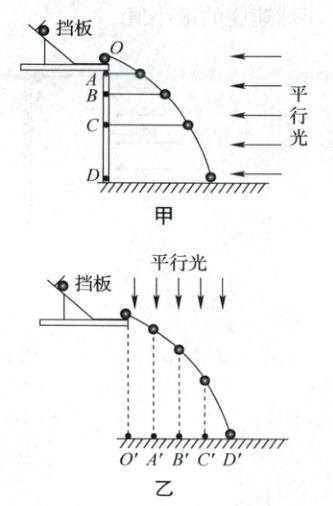 m/s².(2)若将平行光改为沿竖直方向,小球在运动过程中会在地面上留下影子,如图乙所示用频闪照相机拍摄的影子的位置如图中A'、B'、C'、D'点.现测得A'B'=20.20cm,B'C'=20.30cm,C'D'=20.10cm.根据影子的运动情况,可知小球在水平方向上的分运动为