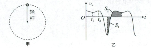1.(多选,2025 湖南长郡二十校联盟模拟)如图甲所示,轻杆一端与一小球相连,另一端连在光滑固定轴上,可在竖直平面内自由转动. 现使小球在竖直平面内做圆周运动,到达某一位置开始计时,取水平向右为正方向,小球的水平分速度 $v_x$ 随时间 $t$ 的变化关系如图乙所示. 不计空气阻力. 下列说法中正确的是