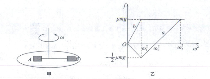 2.(2024 河南周口月考)如图甲所示,质量均为 $m$ 的两个物块 $A$、$B$ 用不可伸长的轻绳相连,放在水平转盘上,初始状态绳子松弛. 已知两物块与转盘之间的动摩擦因数均为 $\mu$,最大静摩擦力等于滑动摩擦力,重力加速度大小为 $g$. 现让转盘由静止缓慢增加转速. 两物块所受摩擦力随角速度平方的变化图像如图乙所示,取摩擦力由 $B$ 指向 $A$ 为正方向,下列说法