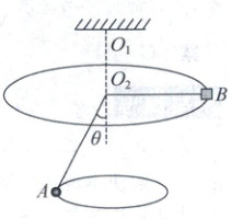3.(2024 湖北武汉期中)水平转盘可以绕竖直轴 $O_1O_2$ 转动,半径 $R = 0.6 m$,转盘中心 $O_2$ 处有一个光滑小孔,用一根长 $L = 1.1 m$ 的细线穿过小孔,将质量分别为 $m_A = 0.2 kg$、$m_B = 0.5 kg$ 的小球 $A$ 和小物块 $B$ 连接,小物块 $B$ 放在水平转盘的边缘且与转盘保持相对静止,如图所示. 现让小球 $A$ 在水平面内做角速度 $\omega_A = 5 rad/s$ 的匀速圆周运动,小物块 $B$ 与水平转盘间的动摩擦因数 $\mu = 0.3$,取 $g = 10 m/s^2$.