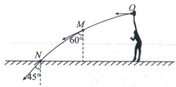 5. (2025 河北名校名师模拟)在 2024 年巴黎奥运会上,郑钦文为中国队获得奥运历史上的第一块单打网球金牌.如图所示为运动员练球时的场景,运动员将网球(可视为质点)从 $ O $ 点以一定速度水平击出,网球经过 $ M $ 点时速度方向与竖直方向的夹角为 $ 60^{\circ} $,落到水平地面上的 $ N $ 点时速度方向与竖直方向的夹角为 $ 45^{\circ} $,且网球与水平地面碰撞后瞬间,其平行于地面的速度分量与碰撞前瞬间相等,垂直于地面的速度分量大小变为碰撞前瞬间的 $ \frac{1}{2} $ 且方向反向.网球与地面碰撞后,弹起的最大高度为 $ h $,不计空气阻力,重力加速度大小为 $ g $,下列说法正确的是 (