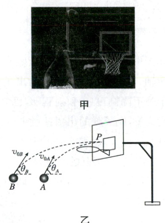 2. (2025 湖南郴州期末质量监测)小郴同学是一名篮球爱好者.如图甲所示,他从同一水平高度的 $ A $、$ B $ 两处先后将篮球投出,都恰好垂直打在篮板的 $ P $ 点,简化图如图乙所示.不计空气阻力.下列说法正确的是 (