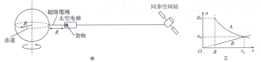 2. (2024 安徽亳州五校期中联考)中国科幻大片《流浪地球 2》中描述的“太空电梯”让人印象深刻。科学家们在地球同步轨道上建造了一个空间站,再用超级缆绳连接地球赤道上的固定基地,通过超级缆绳承载太空电梯,使轿厢沿绳索从地球基地直入太空,而向空间站运送货物。原理如图甲所示,图中的太空电梯正停在离地面高 R 处的站点修整,并利用太阳能给蓄电池充电。图乙中 r 为货物到地心的距离,R 为地球半径,曲线 A 为地球引力对货物产生的加速度大小与 r 的关系;直线 B 为货物由于地球自转而产生的向心加速度大小与 r 的关系。关于相对地面静止在不同高度的电梯中货物,下列说法正确的有 (