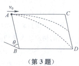 3. (2024 湖北武汉期末)如图所示的光滑固定斜面 $ ABCD $,其倾角 $ \theta $ 可调节. 当倾角为 $ \theta_1 $ 时,一物块(可视为质点)沿斜面左上方顶点 $ A $ 以初速度 $ v_0 $ 水平射入,恰好从底端 $ D $ 点离开斜面;改变倾角为 $ \theta_2 $ 时,同样将该物块沿斜面左上方顶点 $ A $ 以初速度 $ v_0 $ 水平射入,发现物块从 $ CD $ 边中点离开斜面. 已知重力加速度为 $ g $,下列说法正确的是 (