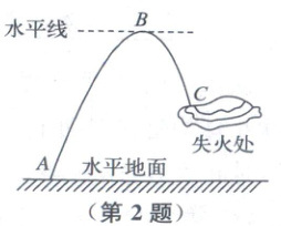 2. (2024 河南郑州期末)如图所示,某次灭火时,消防员在 $ A $ 处用高压水枪将水喷出,水柱经最高点 $ B $ 后落在失火处 $ C $,已知喷出的水在空中的轨迹在同一竖直面内,$ A $、$ B $ 间的高度差与 $ B $、$ C $ 间的高度差之比为 $ 9:4 $,不计空气阻力,下列说法正确的是 (