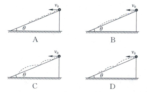 1. (山东青岛期末)从足够长的光滑斜面顶端以初速度 $ v_0 $ 水平抛出一个弹性小球,小球在斜面上经多次弹性碰撞反弹(沿斜面方向的速度不变,垂直斜面方向的速度大小不变、方向相反)后,运动轨迹如下图所示,则四个选项中与实际符合最好的是 (