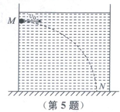 5. (2025 湖北协作体开学考)如图所示,一物体在某液体中运动时只受到重力 $ G $ 和恒定的浮力 $ F $ 的作用,且 $ F = \frac{2}{3}G $. 如果物体从 $ M $ 点以水平初速度 $ v_0 $ 开始运动,最后落在 $ N $ 点,$ MN $ 间的竖直高度为 $ h $,$ M $ 与右壁水平间距为 $ L $,重力加速度为 $ g $,则下列说法正确的是 (
