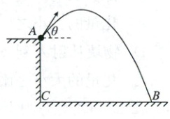 6. (2025 河南部分学校大联考)古人为了守城,会在城池周围修筑高墙,当敌军攻城时可以从城墙上抛掷石块等打击敌军. 如图所示,设石块从高度为 $ 12 $ m 的竖直城墙的外边缘 $ A $ 点斜向上方抛出,其初速度与水平方向的夹角 $ \theta = 53° $,最后石块落于城外水平地面上的 $ B $ 点,落地后不反弹. 将抛出点 $ A $ 在地面上的投影点记为 $ C $ 点,点 $ B $ 和点 $ C $ 的连线长度为 $ 16 $ m,且与城外墙面垂直. 忽略石块所受空气阻力的影响,重力加速度 $ g $ 取 $ 10 $ m/s²,石块可视为质点,取 $ \sin 53° = 0.8 $,$ \cos 53° = 0.6 $. 下列关于石块的运动说法正确的是 (