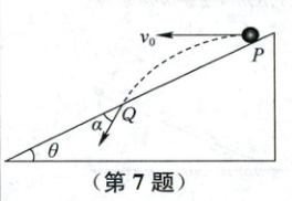 7.AC解析:小球做平抛运动,水平方向有$x = v_{0}t$,竖直方向有$y = \frac{1}{2}gt^{2}$,$v_{y} = gt$,小球落在斜面Q点,有$\tan\theta = \frac{y}{x} = \frac{gt}{2v_{0}}$,小球落在斜面上时的速度与斜面的夹角为$\alpha$,则$\tan(\alpha + \theta) = \frac{v_{y}}{v_{0}} = \frac{gt}{v_{0}} = 2\tan\theta$,由于斜面足够长,把水平抛出时的初速度变为$2v_{0}$,落在斜面上时,位移与水平方向的夹角不变,则夹角$\alpha$将不变,B错误,A正确;小球落在斜面上有$\tan\theta = \frac{y}{x} = \frac{gt}{2v_{0}}$,可得小球在空中的运动时间为$t = \frac{2v_{0}\tan\theta}{g}$,故小球在空中的运动时间变为原来的2倍,C正确;小球在空中运动的水平距离为$x = v_{0}t = \frac{2v_{0}^{2}\tan\theta}{g}$,故小球在空中运动的水平距离一定变为原来的4倍,D错误.