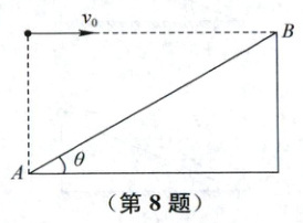 8.ABD解析:若小球以最小位移到达斜面,则位移垂直于斜面,根据平抛运动规律,有$x = v_{0}t$,$y = \frac{1}{2}gt^{2}$,根据几何关系,有$\tan\theta = \frac{x}{y}$,联立解得$t = \frac{2v_{0}}{g\tan\theta}$,A正确;若小球垂直击中斜面,则速度垂直于斜面,根据几何关系,有$\tan\theta = \frac{v_{0}}{v_{y}} = \frac{v_{0}}{gt}$,解得$t = \frac{v_{0}}{g\tan\theta}$,B正确;若小球能击中斜面中点,根据几何关系,有$\tan\theta = \frac{y}{x} = \frac{\frac{1}{2}gt^{2}}{v_{0}t}$,解得$t = \frac{2v_{0}\tan\theta}{g}$,D正确,C错误.