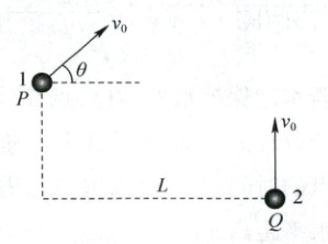 1. (2024 河北期末)如图所示,小球 1、2 分别从 $ P $、$ Q $ 两点同时抛出,抛出时的初速度大小均为 $ v_0 $,小球 1 的初速度与水平方向的夹角为 $ \theta = 37° $,小球 2 的初速度方向竖直向上,两球恰好在空中相遇.已知 $ P $、$ Q $ 两点的水平距离为 $ L $,两小球均可视为质点,不计空气阻力,取 $ \sin 37° = 0.6 $,$ \cos 37° = 0.8 $,则 $ P $、$ Q $ 两点的高度差为 (