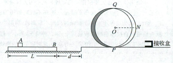 3. (2025湖北武汉调研模拟)有一款闯关游戏可以简化为如图所示的模型。可视为质点的物块A和长L=16m的木板B叠放在左侧粗糙水平地面上,A、B的质量分别为m_A=50g和m_B=10g,A、B之间以及B与地面之间的动摩擦因数分别为μ₁=0.2和μ₂=0.1。距B右侧d=8m处有一与B上表面平齐的光滑台面,台面上固定一半径可调的光滑圆弧轨道,圆弧轨道底端两侧稍微错开,分别与左右台面平滑过渡(未画出),N与圆心O等高。现让A从B上合适的位置以合适的初速度v_0开始向右滑动,游戏环节中A只能经由B的右端滑上台面,沿圆弧轨道做完整的圆周运动,并最终被接收盒“捕获”,游戏便获得成功。已知B与台面相碰反弹运动一小段距离便被锁定静止不动,最大静摩擦力等于滑动摩擦力,重力加速度g取10m/s²。求: