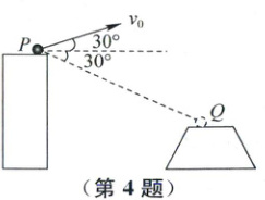 4. BD 解析:将初速度分解为沿 PQ 方向的分速度$v_{1}$和垂直 PQ 方向的分速度$v_{2}$,则有$v_{1} = v_{0} \cos 60^{\circ} = 10 m/s$,$v_{2} = v_{0} \sin 60^{\circ} = 10\sqrt{3} m/s$,将重力加速度分解为沿 PQ 方向的分加速度$a_{1}$和垂直 PQ 方向的分加速度$a_{2}$,则有$a_{1} = g · \sin 30^{\circ} = 5 m/s^2$,$a_{2} = g\cos 30^{\circ} = 5\sqrt{3} m/s^2$,垂直 PQ 方向根据对称性可得重物运动时间为$t = 2 · \frac{v_{2}}{a_{2}} = 4 s$,重物离 PQ 连线的最远距离为$d_{\max} = \frac{v_{2}^{2}}{2a_{2}} = 10\sqrt{3} m$,A、C 错误;重物落地时竖直分速度大小为$v_{y} = -v_{0} \sin 30^{\circ} + gt = 30 m/s$,则落地速度与水平方向夹角的正切值为$\tan \theta = \frac{v_{y}}{v_{x}} = \frac{v_{y}}{v_{0} \cos 30^{\circ}} = \sqrt{3}$,可得$\theta = 60^{\circ}$,B 正确;从抛出到最高点所用时间为$t_{1} = \frac{v_{0} \sin 30^{\circ}}{g} = 1 s$,则从最高点到落地所用时间为$t_{2} = t - t_{1} = 3 s$,轨迹最高点与落点的高度差为$h = \frac{1}{2}gt_{2}^{2} = 45 m$,D 正确.