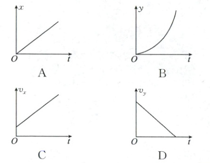 1. AD 解析:小鱼在运动过程中只受重力作用,则小鱼在水平方向上做匀速直线运动,即$v_{x}$为定值,则有水平位移$x = v_{x}t$,故 A 正确,C 错误;小鱼在竖直方向上做竖直上抛运动,则$y = v_{y0}t - \frac{1}{2}gt^{2}$,$v_{y} = v_{y0} - gt$,且在最高点时竖直方向的速度为 0,故 B 错误,D 正确.