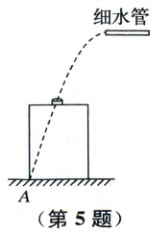 5. C 解析:设出水孔到水桶中心的水平距离为 x,则$h = \frac{1}{2}gt_{1}^{2}$,$x = v_{0}t_{1}$,落到桶底 A 点时$2h = \frac{1}{2}gt_{2}^{2}$,$x + \frac{D}{2} = v_{0}t_{2}$,解得$v_{0} = \frac{(\sqrt{2} + 1)D}{2} \sqrt{\frac{g}{2h}}$,故 C 正确.