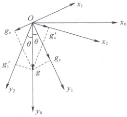 (4) 如图所示,$x_{0}$、$y_{0}$分别表示水平和竖直方向,设重垂线方向$y_{0}$与$y$轴间的夹角为$\theta$,建立坐标系存在两种情况,如图所示,当建立的坐标系为$x_{1}Oy_{1}$时,则$x$轴方向小球做匀减速运动,根据逐差法计算加速度,有$x_{2} - 2x_{1} = -g\sin\theta(2T)^{2}$,$y$轴方向有$y_{2} - 2y_{1} = g\cos\theta(2T)^{2}$,联立解得$\tan\theta = \frac{2x_{1} - x_{2}}{y_{2} - 2y_{1}}$.当建立的坐标系为$x_{2}Oy_{2}$时,则$x$轴方向小球做匀加速运动,根据逐差法计算加速度,有$x_{2} - 2x_{1} = g\sin\theta(2T)^{2}$,$y$轴方向有$y_{2} - 2y_{1} = g\cos\theta(2T)^{2}$,解得$\tan\theta = \frac{x_{2} - 2x_{1}}{y_{2} - 2y_{1}}$.综上所述,重垂线方向与$y$轴间夹角的正切值为$\tan\theta = \frac{|x_{2} - 2x_{1}|}{y_{2} - 2y_{1}}$.