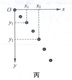 个位置.(4) 某同学实验时忘了标记重垂线方向,为解决此问题,他在频闪照片中,以某位置为坐标原点,沿任意两个相互垂直的方向作为$x$轴和$y$轴正方向,建立直角坐标系$xOy$,并测量出另外两个位置的坐标值$(x_{1},y_{1})$、$(x_{2},y_{2})$,如图丙所示.根据平抛运动规律,利用运动的合成与分解的方法,可得重垂线方向与$y$轴间夹角的正切值为