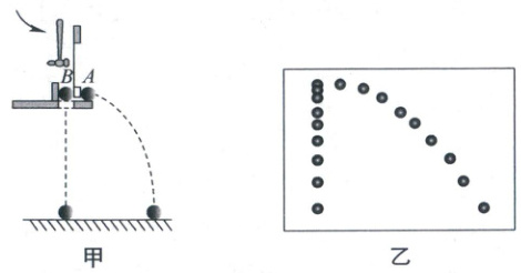 (2) 如图甲所示的实验中,$A$球沿水平方向抛出,同时$B$球自由落下,借助频闪仪拍摄上述运动过程.图乙为某次实验的频闪照片,在误差允许范围内,根据任意时刻$A$、$B$两球的竖直高度相同,可判断$A$球竖直方向做
