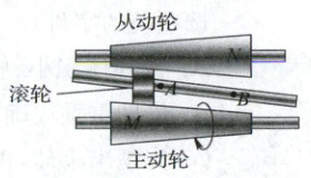 3. (江苏南通期中)无级变速是在变速范围内任意连续变换速度的变速系统. 无级变速模型如图所示,主动轮 $ M $、从动轮 $ N $ 中间有一滚轮,$ M $ 的转速一定,各轮间不打滑,通过滚轮位置改变实现无级变速. $ A $、$ B $ 为滚轮轴上的两点,则 (