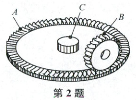 2. (2024 浙江期中)如图所示为某工程中的一种齿轮传动装置,$ A $、$ B $ 通过齿轮咬合,$ A $、$ C $ 通过轴承联动,$ A $、$ B $、$ C $ 点的半径之比为 $ 5:3:1 $. 当齿轮传动装置匀速转动时,下列关于 $ A $、$ B $、$ C $ 点各物理量的说法正确的是 (