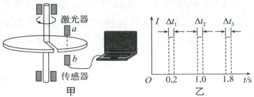 4. (多选,2025 山东青岛期中)如图,水平放置的圆盘绕竖直固定轴匀速转动,在圆盘上沿半径开有一条宽度为 $ 2 \mathrm{mm} $ 的均匀缝,将激光器 $ a $ 与传感器 $ b $ 上下对准,$ a $、$ b $ 可以同步地沿圆盘半径方向匀速移动. 当狭缝经过 $ a $、$ b $ 之间时,$ b $ 接收到一个激光信号,图乙为 $ b $ 所接收的光信号强度 $ I $ 随时间 $ t $ 变化的图线,图中 $ \Delta t_{1}=1.0 × 10^{-3} \mathrm{s} $,$ \Delta t_{2}=0.8 × 10^{-3} \mathrm{s} $. 下列说法正确的是 (