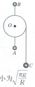 6.AB 解析:圆盘转两圈过程中$2 × 2\pi R = \frac{1}{2} × \frac{1}{2}gt^2$,得$t = 4\sqrt{\frac{\pi R}{g}}$,A正确;圆盘转两圈时,小球C的速度,即圆盘边缘线速度为$v = \frac{1}{2}gt = 2\sqrt{\pi Rg}$,圆盘角速度,即小球A的角速度为$\omega = \frac{v}{R} = 2\sqrt{\frac{\pi g}{R}}$,B正确,C错误;圆盘转两圈时,小球B的线速度大小为$v_B = \omega · 2R = 4\sqrt{\pi Rg}$,D错误.