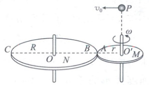 8. (2025 山西部分学校联考)如图所示,靠在一起的 $ M $、$ N $ 两转盘靠摩擦传动,两盘均绕过圆心的竖直轴转动,$ M $ 盘的半径为 $ r $,$ N $ 盘的半径 $ R = 2 r $. $ A $ 为 $ M $ 盘边缘上的一点,$ B $、$ C $ 为 $ N $ 盘直径的两个端点. 当 $ O' $、$ A $、$ B $、$ C $ 共线时,从 $ O' $ 的正上方 $ P $ 点以初速度 $ v_0 $ 沿 $ O'O $ 方向水平抛出一小球. 小球落至圆盘上 $ C $ 点,重力加速度为 $ g $. 下列说法正确的是 (