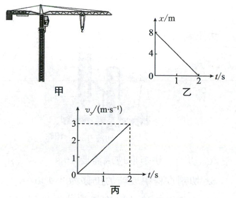 5. (2024 广东东莞期末)各种大型的货运站中少不了悬臂式起重机.如图甲所示,某起重机的悬臂保持不动,可沿悬臂行走的天车有两个功能,一是吊着货物沿竖直方向运动,二是吊着货物沿悬臂水平方向运动.天车吊着质量为100kg的货物在x方向的位移—时间图像和y方向的速度—时间图像分别如图乙、丙所示,下列说法正确的是 (