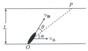 4. (多选)如图所示,小船从河岸的O点沿虚线匀速运动到河对岸的P点,河水的流速v_水、船在静水中的速度v_静与虚线的夹角分别为α、θ,河宽为L,且v_静、v_水的大小不变,渡河的时间为t,河水的流动方向与河岸平行,则下列说法正确的是 (