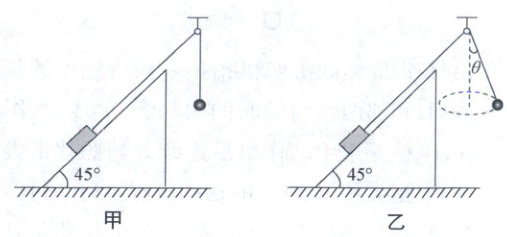 8. (2024 江苏前黄中学期末)如图甲所示,倾角为$45^{\circ }$的斜面置于粗糙的水平地面上,有一滑块通过轻绳绕过定滑轮与质量为 m 的小球相连(绳与斜面平行),滑块质量为 2m,滑块恰好静止在粗糙的斜面上.在图乙中,换成让小球在水平面上做匀速圆周运动,轻绳与竖直方向的夹角为θ,且$θ≤45^{\circ }$,此时滑块、斜面仍然处于静止状态,重力加速度为 g,则下列说法正确的是 (