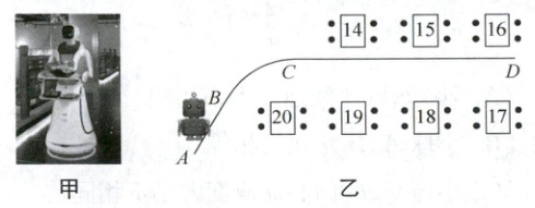 5. (2024 四川成都阶段检测)图甲是正在水平面内工作的送餐机器人,该机器人沿图乙中 ABCD 曲线给 16 号桌送餐,已知弧长和半径均为 4 m 的圆弧 BC 与直线路径 AB、CD 相切,AB 段长度也为 4 m,CD 段长度为 12 m,机器人从 A 点由静止匀加速出发,到 B 点时速率恰好为 1 m/s,接着以 1 m/s 的速率匀速通过 BC,通过 C 点后以 1 m/s 的速率匀速运动到某位置后开始做匀减速直线运动,最终停在 16 号桌旁的 D 点.已知餐盘与托盘间的动摩擦因数$\mu =0.1$,下列关于该运动的说法正确的是 (
