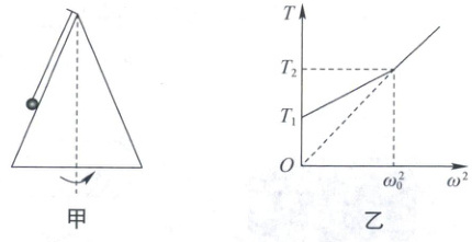 10.A 解析:设线长为 $L$,锥体母线与竖直方向的夹角为 $\theta$,当角速度为 $0$ 时,小球静止,受重力、支持力和线的拉力而平衡,此时有 $T_{1}=mg\cos \theta$,当角速度增大时,线上的拉力增大,小球受到的支持力减小,当支持力减小到 $0$ 时,角速度为 $\omega _{0}$,当小球的角速度小于 $\omega _{0}$ 时,水平方向有 $T\sin \theta - N\cos \theta = m\omega ^{2}L\sin \theta$,竖直方向有 $T\cos \theta + N\sin \theta = mg$,整理有 $T = m\omega ^{2}L\sin ^{2}\theta + mg\cos \theta$.结合题图乙有 $\frac{T_{2}-T_{1}}{\omega _{0}^{2}}=mL\sin ^{2}\theta$,当小球的角速度大于 $\omega _{0}$ 时,小球将离开锥面,此时线与竖直方向的夹角为 $\alpha$,竖直方向有 $T\sin \alpha = m\omega ^{2}L\sin \alpha$,可得 $T = m\omega ^{2}L$,此时图像的反向延长线经过原点,结合题图乙有 $\frac{T_{2}}{\omega _{0}^{2}}=mL$,综上所述,有 $\frac{T_{2}-T_{1}}{\omega _{0}^{2}}=mL\sin ^{2}\theta$,$\frac{T_{2}}{\omega _{0}^{2}}=mL$,$T_{1}=mg\cos \theta$,联立解得 $L=\frac{\sqrt{T_{2}g}}{\sqrt{T_{1}\omega _{0}^{2}}}$,故 A 正确.