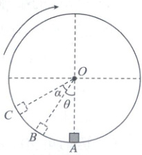 11. (多选)一水平放置的圆筒,截面图如图所示,O 为转轴.现让圆筒绕中心轴沿顺时针方向高速旋转,某时刻把一小物块轻轻放在圆筒轴线正下方的 A 点,物块在圆筒的带动下随之运动,物块运动到最高点 C 后又会滑下来,最终停留在 B 点.已知$∠AOB=θ,∠BOC=α$,各处动摩擦因数相同.下列说法正确的是(
