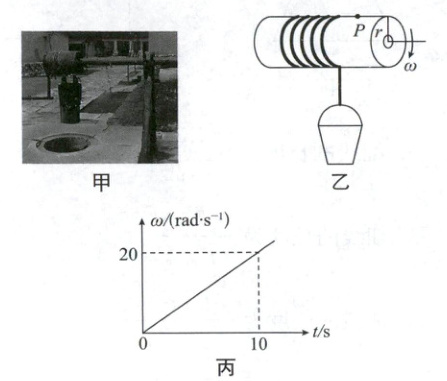 1.C 解析:根据图像丙可知,轮轴角速度随时间变化的关系为$\omega=\frac{20}{10}t(rad/s)=2t(rad/s)$,$t=2.5 s$时,$P$点的角速度大小为$\omega=2×2.5 rad/s=5 rad/s$,故A错误;根据$v=\omega r$,可得$t=5 s$时,水斗的速度大小为$v=2×5×0.1 m/s=1 m/s$,故B错误;轮轴边缘$P$点的速率随时间变化的规律为$v=\omega r=2t×0.1(m/s)=0.2t(m/s)$,故C正确;根据$a=\omega^2r$,可得$t=10 s$时,$P$点的向心加速度大小为$a=(2×10)^2×0.1 m/s^2=40 m/s^2$,故D错误。