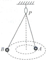 2. (2024 辽宁大连期中)天花板下悬挂的轻质光滑小圆环$P$可绕过悬挂点的竖直轴无摩擦地旋转。一根轻绳穿过$P$,两端分别连接质量为$m_1$和$m_2$的小球$A$、$B(m_1 > m_2)$。设两球同时做如图所示的圆锥摆运动,且任意时刻两球均在同一水平面内,则(